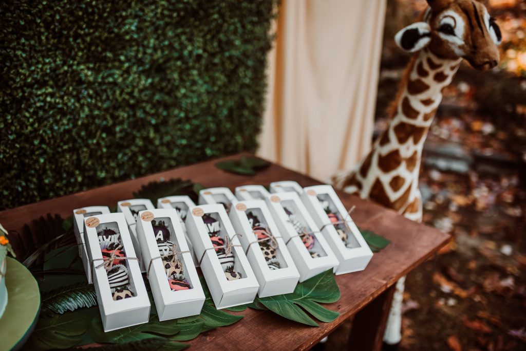 Anita and Ana worked with my vendors beautifully to create an Instagram-worthy backdrop with the marquee letters, balloon arches, and leafy green backdrop. I should also say that I had an Etsy vendor, Panhandle Mercantile, who made a wooden sign (“Avik’s Wild One”) to go on the backdrop. And of course, I cannot leave out Honeysuckle + Holly Photography whose artistic director, Christina, immortalized the entire party with candid photographs. As party favors as the family was heading out, we gave custom chocolate covered strawberries beautifully hand-dipped and decorated by Olena, owner of Bouquets of Strawberries in Agawam, MA.