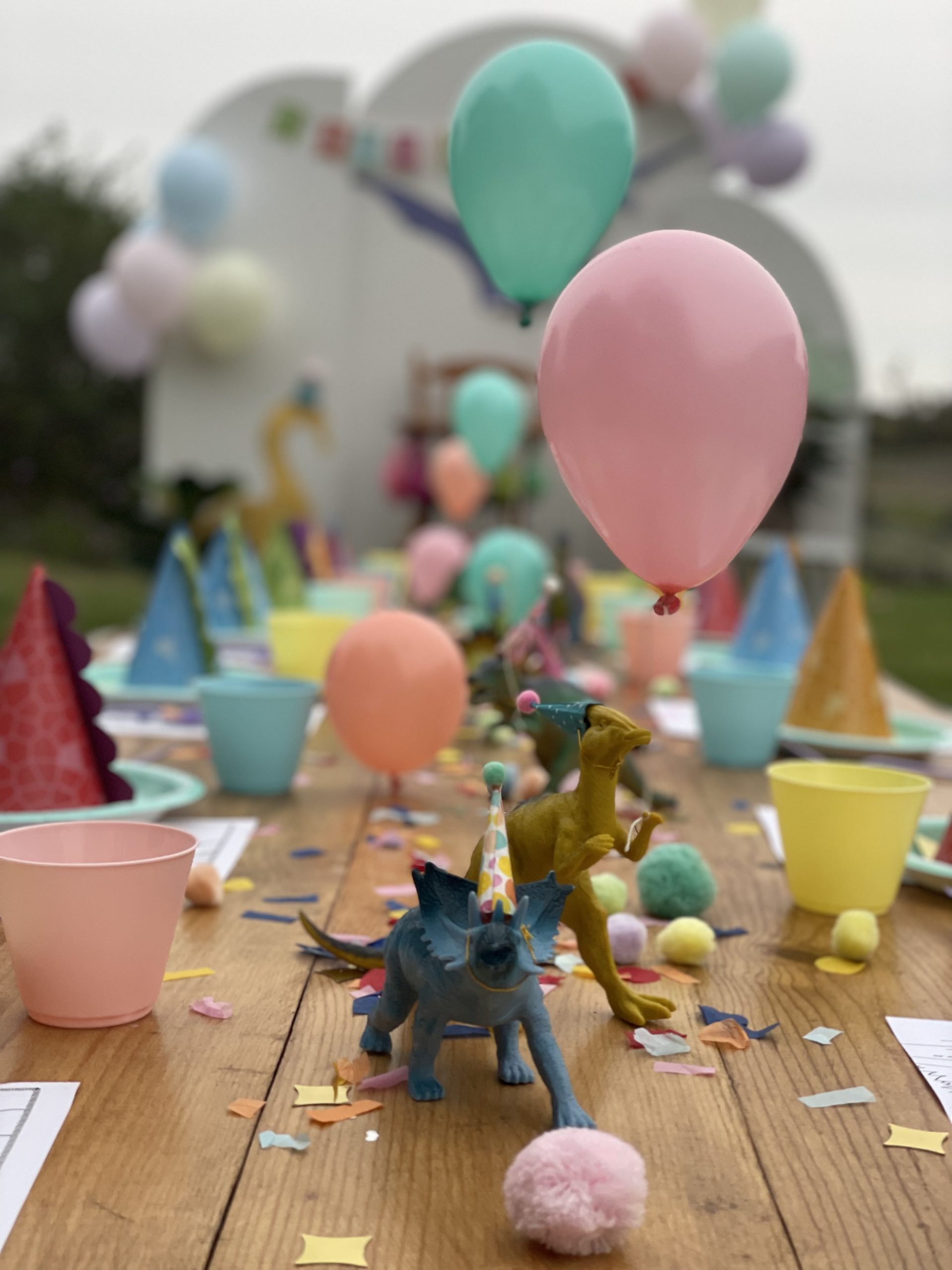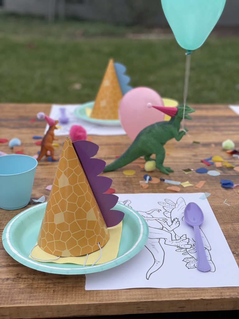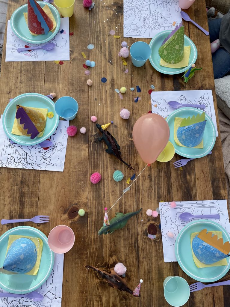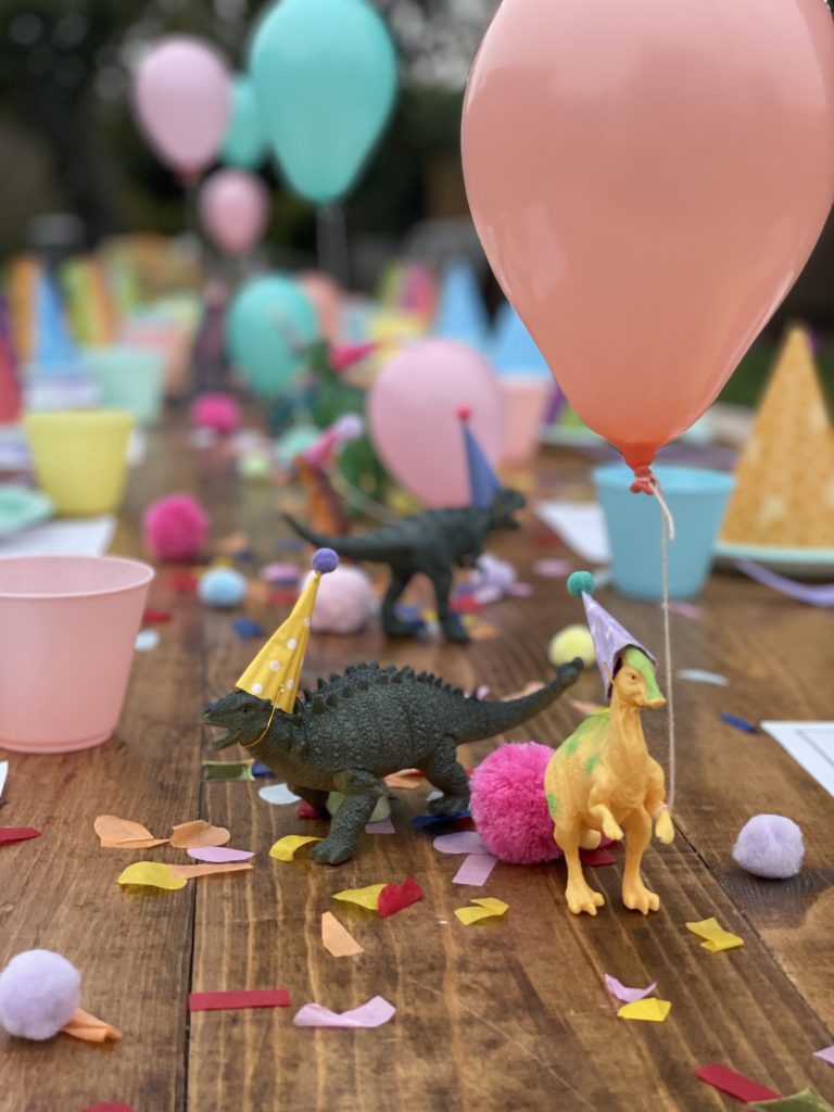 Onto perhaps maybe the most fun part of the party design, the kids table! In addition to the pastel disposable cups, napkins, plates and flatware, I purchased a few more fun sensory and colorful items to add to the overall table design. The most impactful was the dinosaur figures which were gifted a while back and didn’t cost me a cent! To make the normally ferocious dinosaurs look more cute and kid friendly, I topped them off with the most adorable tiny party hats from an Etsy shop! I couldn’t resist buying some but also made a few myself. Of course my DIY party hats weren’t as nice looking but still looked cute and saved me some cash. My FAVORITE detail has got to be the tiny helium balloons that we tied to a few of the dinosaurs and it made it look like they were holding the balloons. These party animals behaved so well they didn’t even bite anyone. In addition to the dinos I spread out fluffy pom poms and colorful confetti across the middle to create a table runner like effect. End result was super fun and colorful and added a lot of dimension to the table! I also added a kids dinosaur party hat on each plate which also added dimension to the table but was also very fun for the kids to wear. Lastly, what’s a kids table without some coloring options! Under each plate and cup I placed a dinosaur coloring page almost like a placemat, added crayons throughout the tables and that’s it! The kids table turned out BEYOND ADORABLE! The end result was cute and actually practical for kids! They enjoyed the dinosaur figures, the pom poms and of course the coloring pages.Â