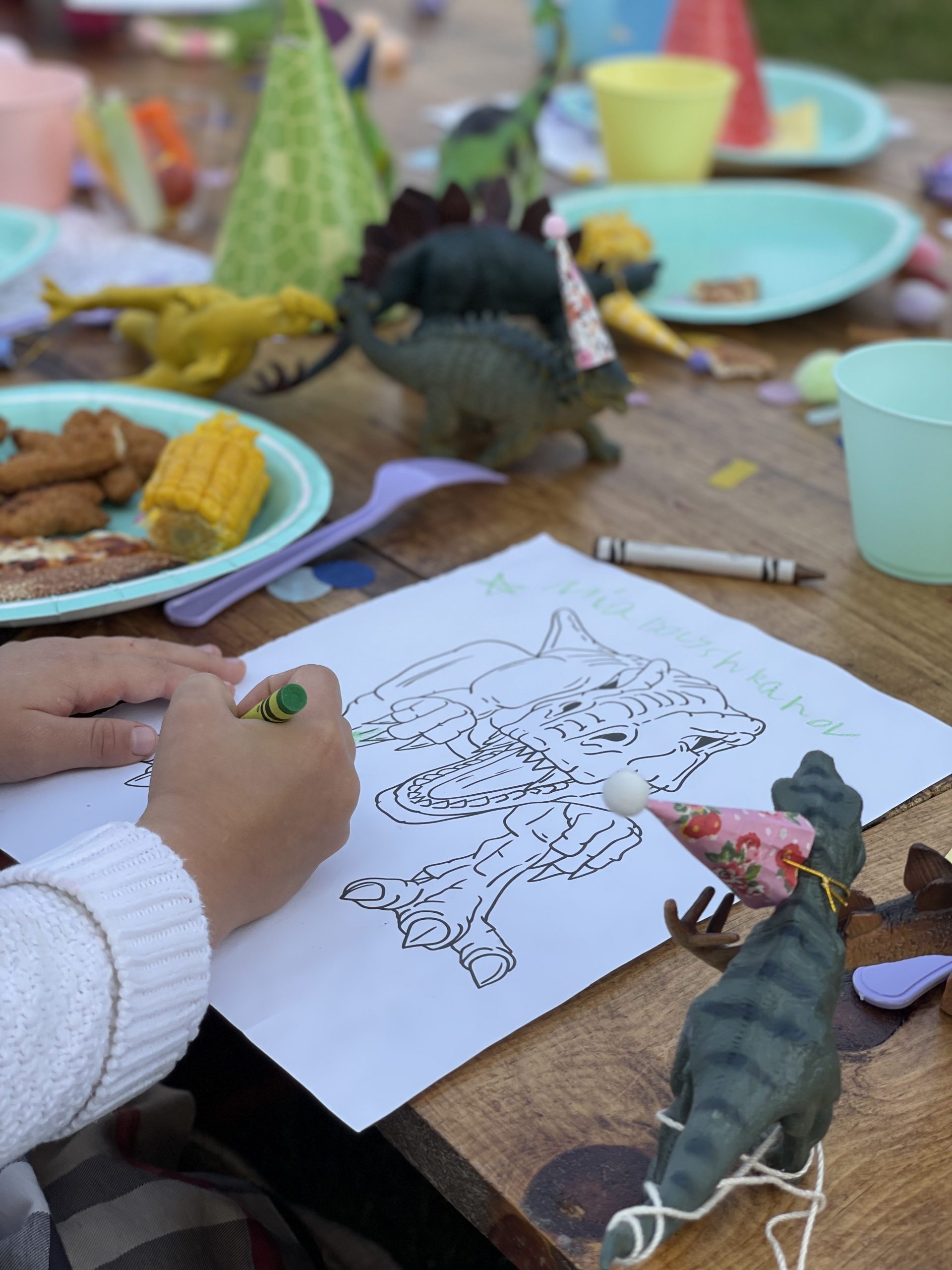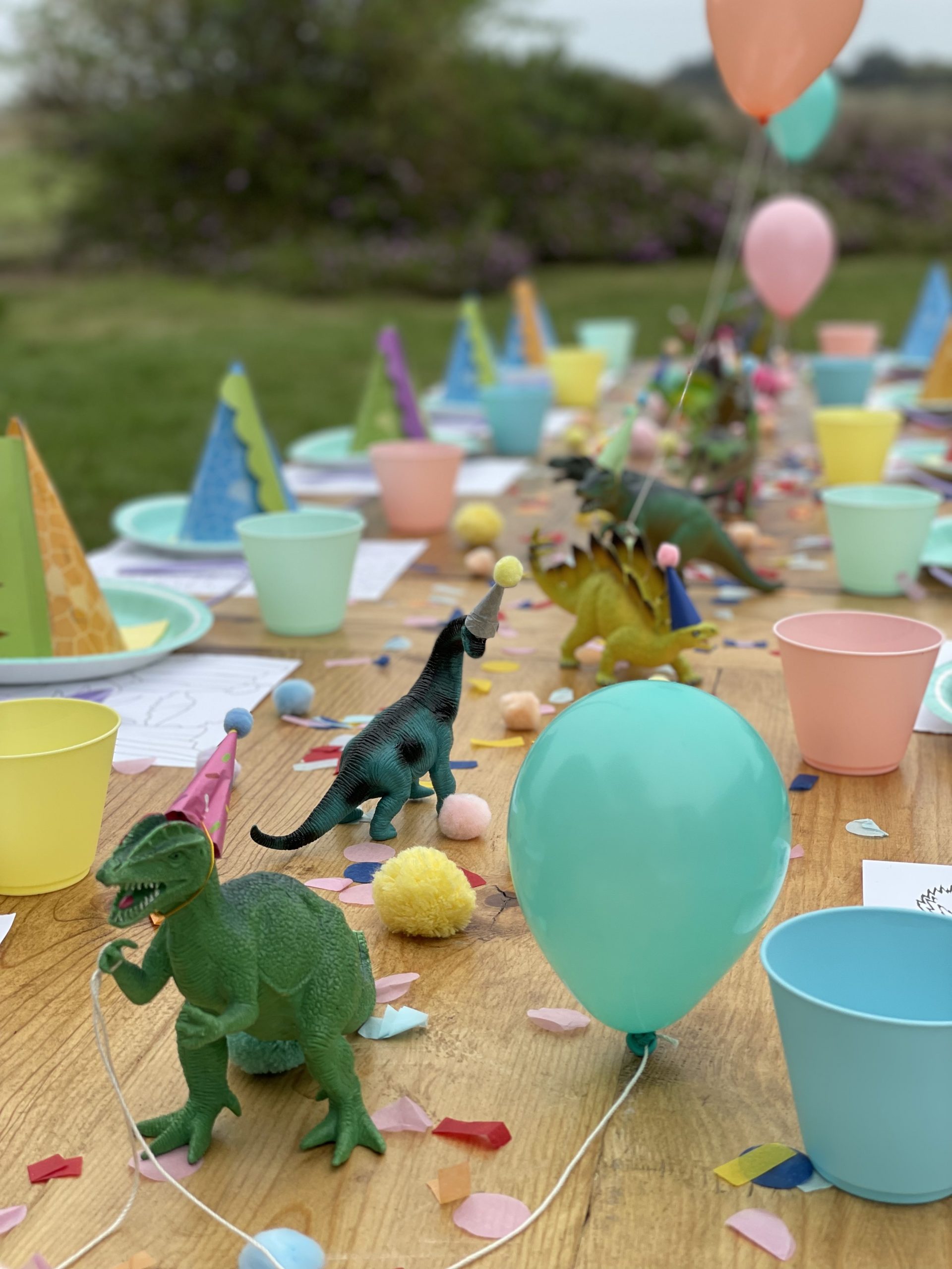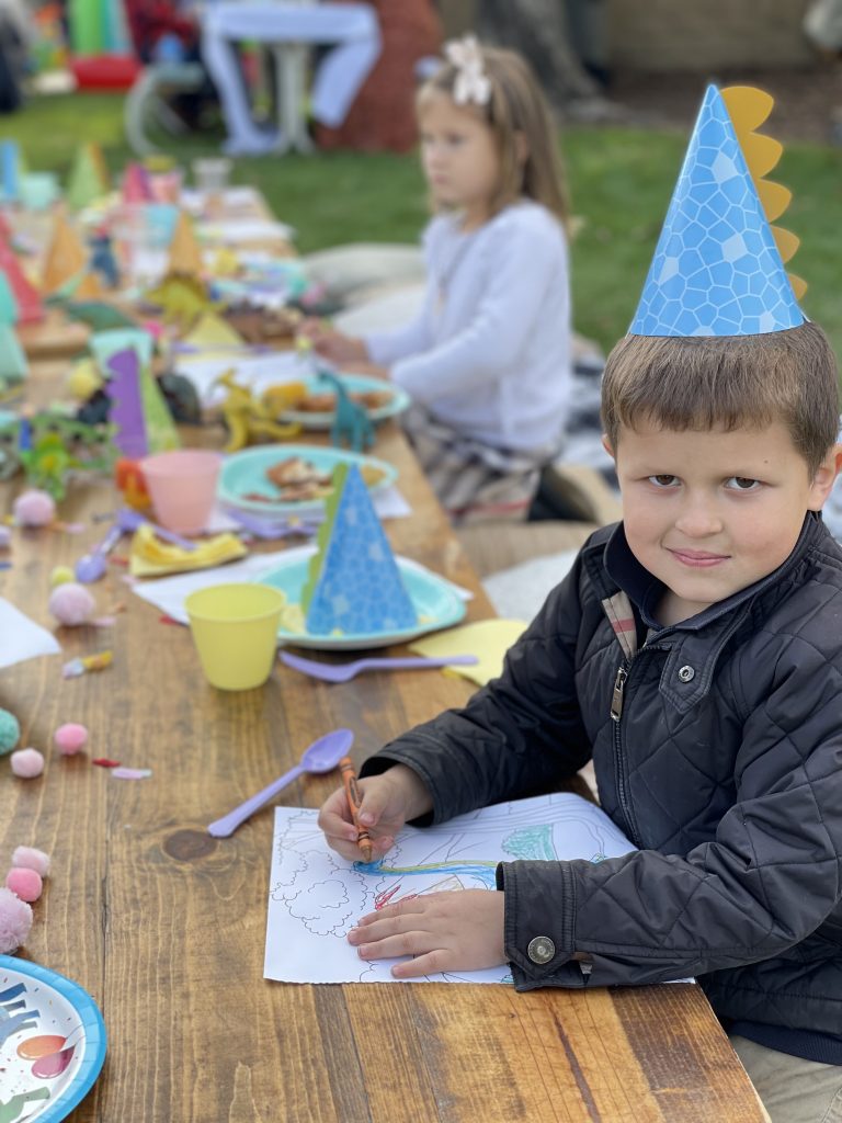 Onto perhaps maybe the most fun part of the party design, the kids table! In addition to the pastel disposable cups, napkins, plates and flatware, I purchased a few more fun sensory and colorful items to add to the overall table design. The most impactful was the dinosaur figures which were gifted a while back and didn’t cost me a cent! To make the normally ferocious dinosaurs look more cute and kid friendly, I topped them off with the most adorable tiny party hats from an Etsy shop! I couldn’t resist buying some but also made a few myself. Of course my DIY party hats weren’t as nice looking but still looked cute and saved me some cash. My FAVORITE detail has got to be the tiny helium balloons that we tied to a few of the dinosaurs and it made it look like they were holding the balloons. These party animals behaved so well they didn’t even bite anyone. In addition to the dinos I spread out fluffy pom poms and colorful confetti across the middle to create a table runner like effect. End result was super fun and colorful and added a lot of dimension to the table! I also added a kids dinosaur party hat on each plate which also added dimension to the table but was also very fun for the kids to wear. Lastly, what’s a kids table without some coloring options! Under each plate and cup I placed a dinosaur coloring page almost like a placemat, added crayons throughout the tables and that’s it! The kids table turned out BEYOND ADORABLE! The end result was cute and actually practical for kids! They enjoyed the dinosaur figures, the pom poms and of course the coloring pages.Â