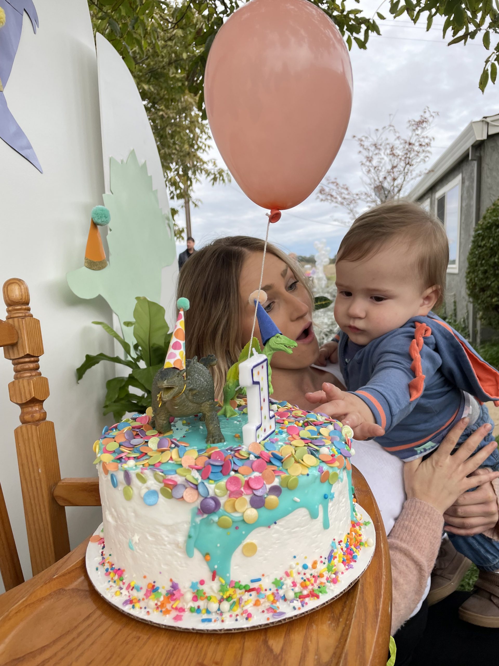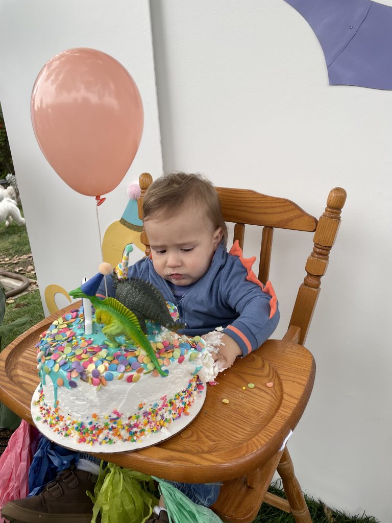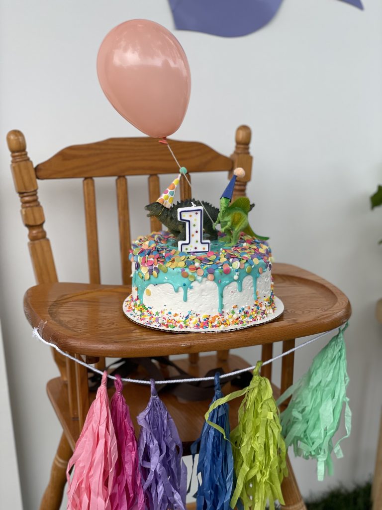 Now onto the cake! I am definitely a fan of cute smash cake but definitely not a fan of ordering an expensive custom cake only for it to be smashed and smeared all over the floor! Instead I opted for buying a cake from my local grocery store – Rayleys. Luckily for me, they usually always have a few options of cute kiddish cakes with sprinkles and that is exactly what I needed! After reviewing the options, I chose the 10 inch, white frosted cake with sprinkles that had a light blue glaze over the top. At home I customized the cake by adding a bit more sprinkles, well actually a lot more sprinkles. Then I added the number one candle, mini dinosaur figures and topped off with a tiny helium balloon. I was absolutely in love with how the cake turned out and it was not pricey! (Still had money leftover for a quick Starbucks run).