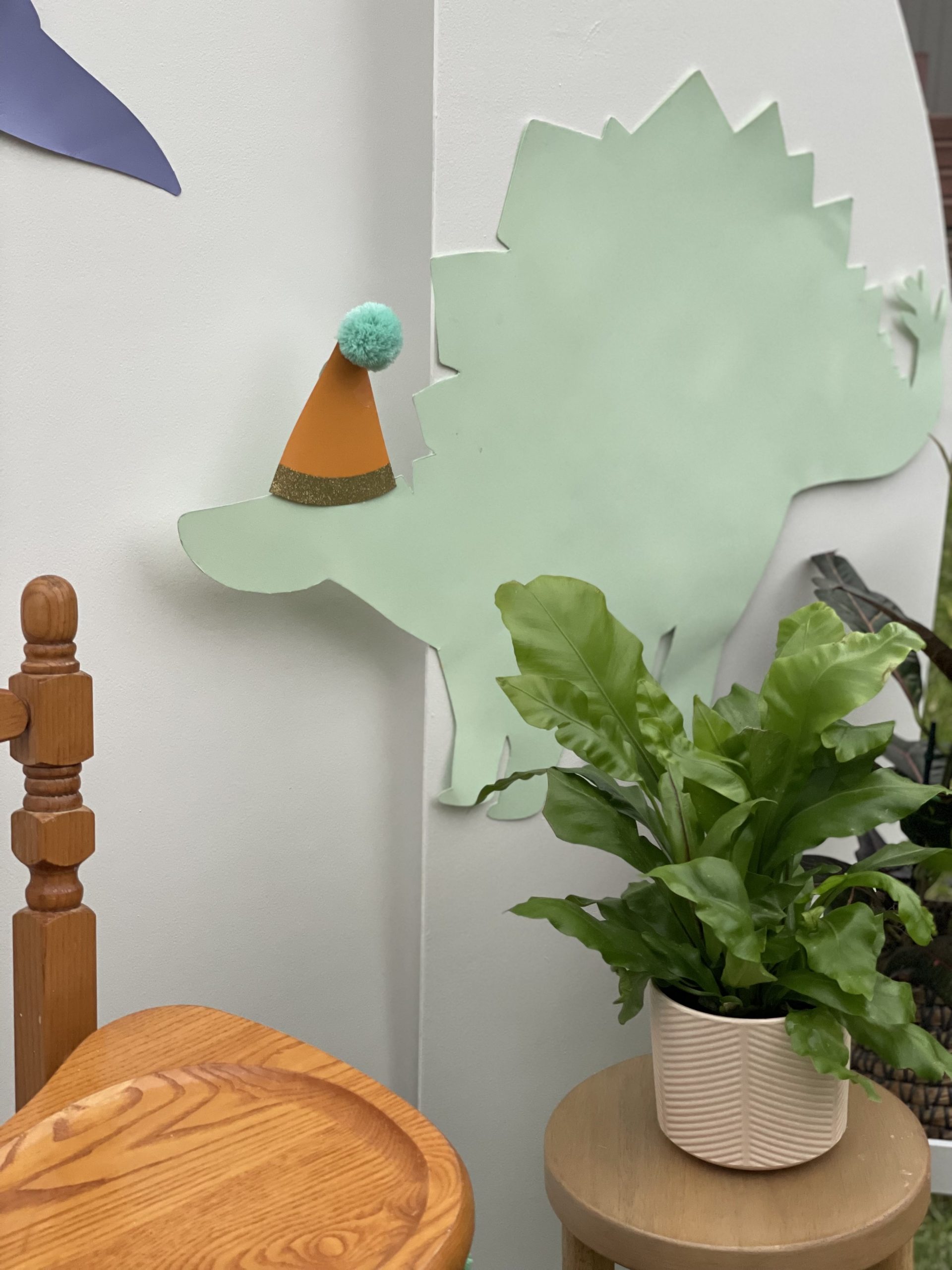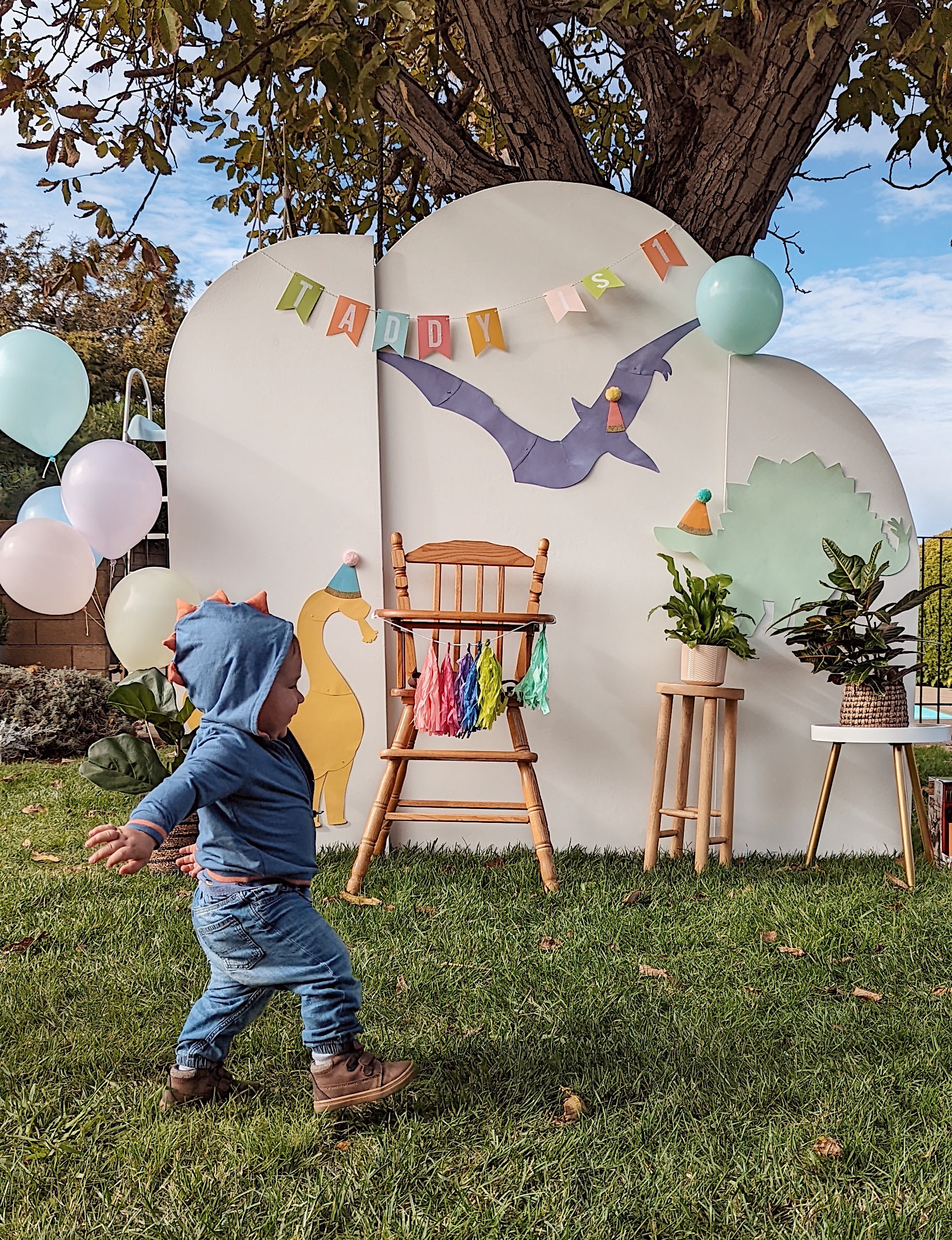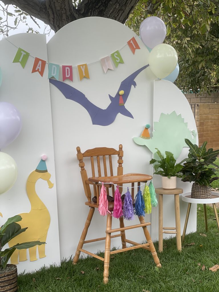 Let’s start with the backdrop! I bought the dinosaur cutouts from Dollar Tree and spray painted them in various pastel colors to achieve the “minimalist cutesy dino look”. Then, I topped them off with fun party hats from Target that I cut in half and attached to the dinos to which I added a 3D-sensory element by adding pom poms to the tops of the party hats. No party is complete without a birthday banner so I found the perfect pastel banner where I was able to use sticker letters to customize the wording. For the finishing touches, I ordered helium balloons to frame the backdrop instead of making a balloon garland. Don’t get me wrong, I LOVE a good balloon garland and I hope they never go out of style but there’s something about classic helium balloons that is so cute and nostalgic. They are also a cheaper balloon option and were a huge hit with the kiddos too! Little ones always love to play with helium balloons 🙂 It’s not a first birthday without a highchair. It’s perfect to place the smash cake on and keep the little one in place for photos. I kept the high chair decorations pretty simply and just added a cute little tassel garland across the front, of course also in pastel tones. Then to finish off the backdrop, I added some real and faux plants from around the house for a Jurassic and tropical look to the design but still keeping with the overall minimalist look I was going for. Overall the backdrop turned out visually simple and not overstimulating yet fun and amusing for the little ones and guests!