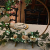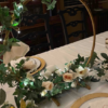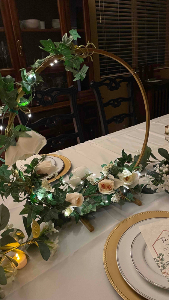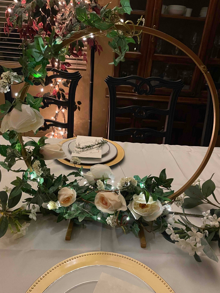 Gold ring centerpieces. stand about 24″ tall. Ivory roses.