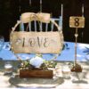 Centerpieces come with diamond shaped crystal gems to spread around the table, matching wood table numbers, and 2 white votives. Table numbers have a black painted wood number, rhinestone corners, 2 silver dusted wooden hearts on stand, and a base with matching greenery and a small burlap rosette. Votives are wrapped in burlap and adorned with 2 rhinestones and silver dusted wood hearts.