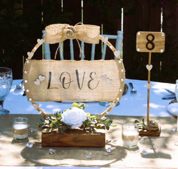 Let the new Mr. and Mrs. and all things love shine on your wedding day!12 inch wooden hoops are stained in special walnut and wrapped with wide burlap. “Mr. and Mrs.” and “Love” are hand painted in black across the burlap.