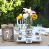A white table number is hand painted onto burlap and then decorated with a stained wood captain’s wheel, navy blue painted wood anchors, and tiny bronze metal anchors.