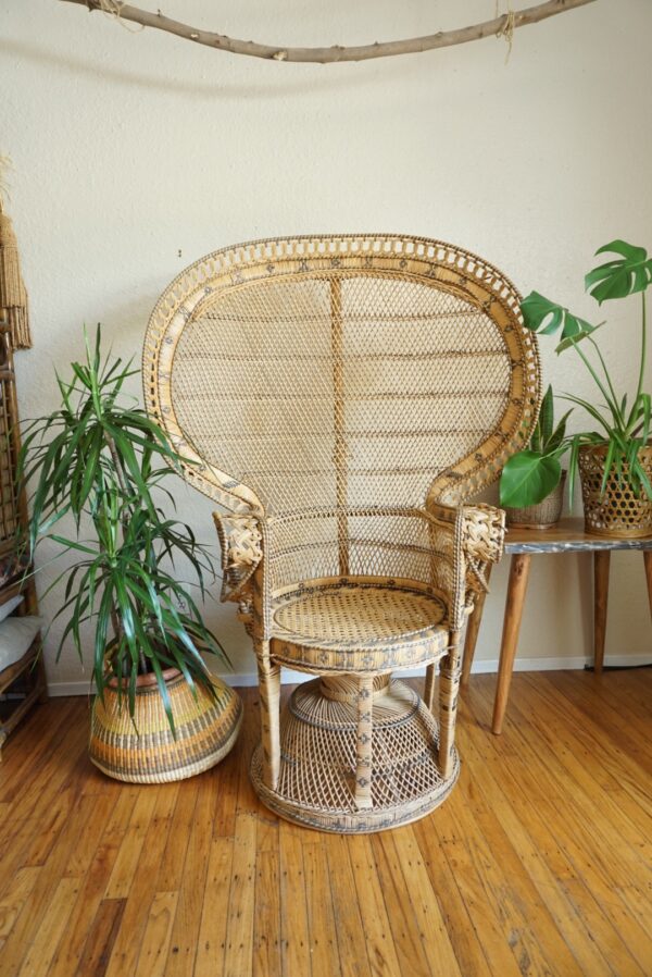 The “Tiffany” is our gorgeous traditional Emmanuelle-style peacock chair with black ornate woven pattern on the rim. This gorgeous peacock chair can be used in a variety of settings — from boho-inspired weddings to baby showers and photoshoots. Rent your classic peacock chair for your party or wedding today. Check out our inventory for more peacock chairs and contact us for more available vintage furniture and decor!