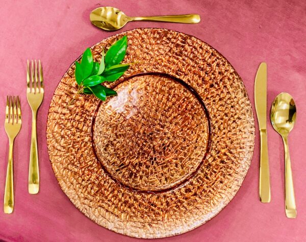 brown, CHARGER, CHARGER PLATE, COPPER, GLASS, orange, plate