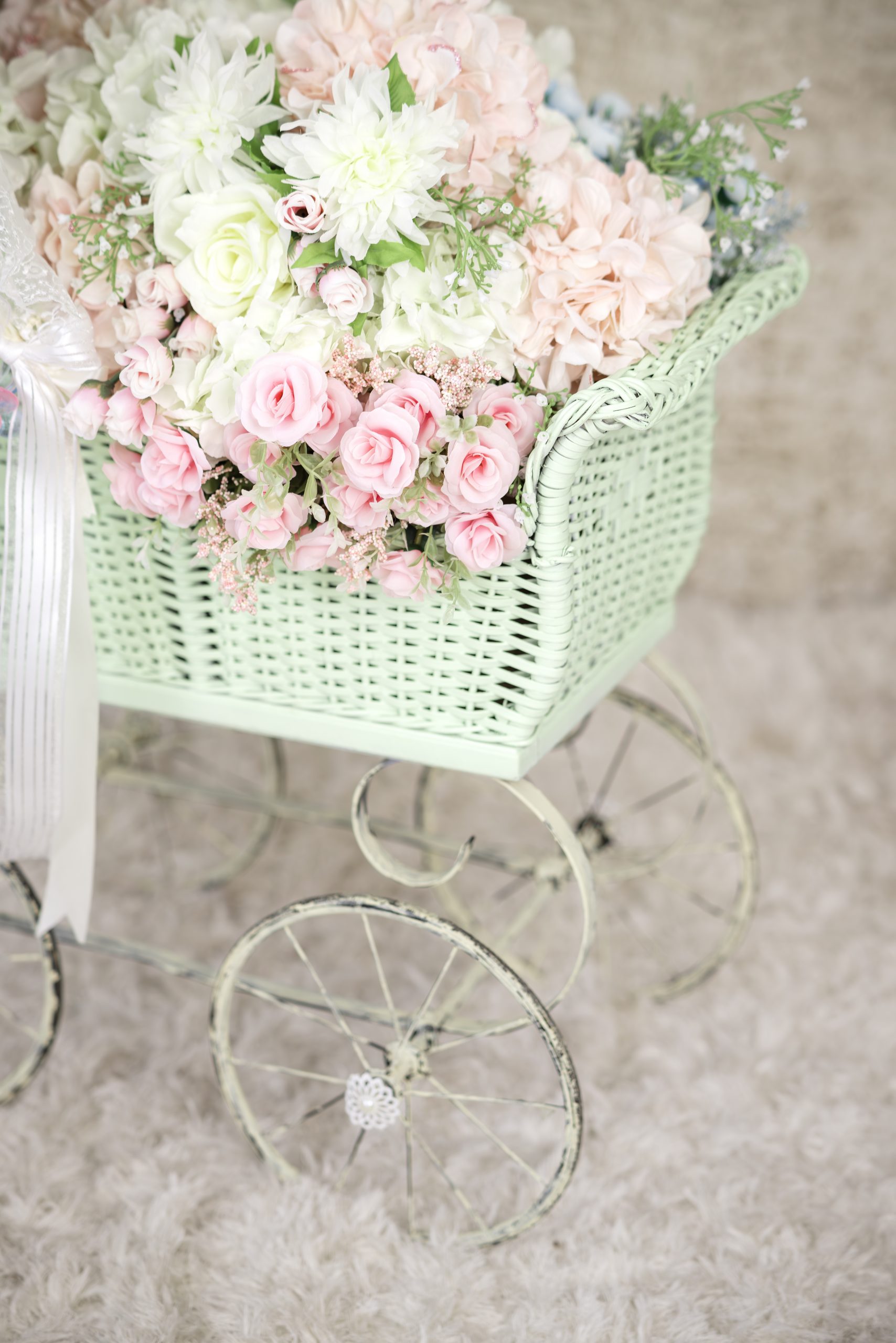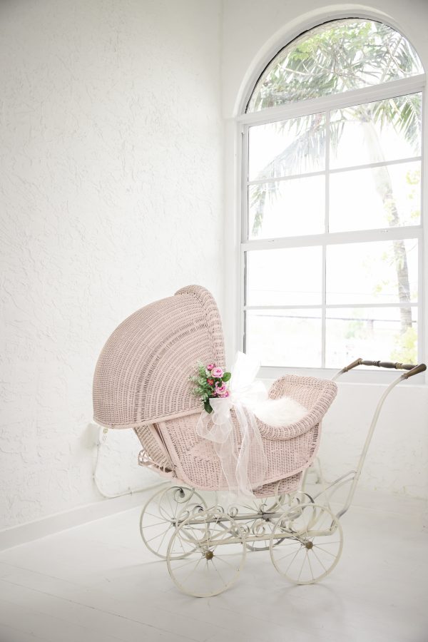 Beautiful full size vintage wicker baby carriage rental for baby showers and gender reveal parties! Price includes delivery and pick up in Miami Metro Area only. Extra charge for Broward delivery.
