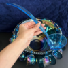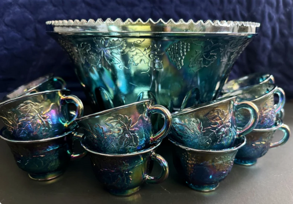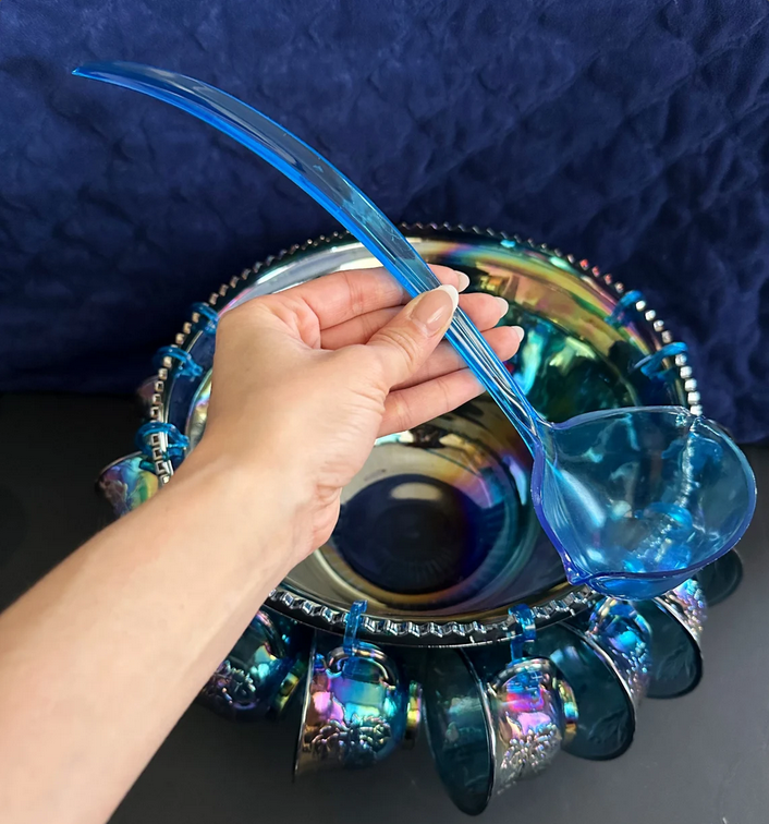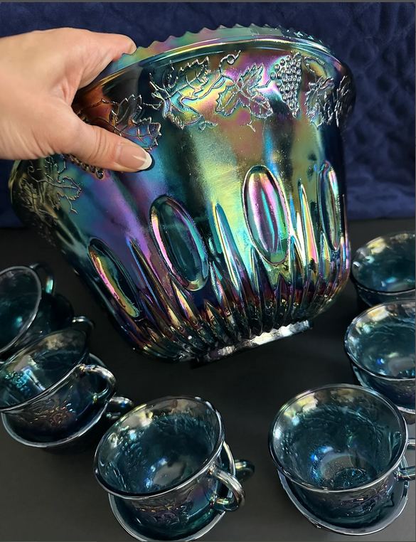 *Harvest Grape Iridescent Glass Blue Punch Bowl w/ladle (12 hooks included) plus 12 cups