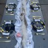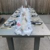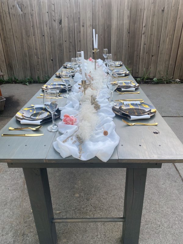 Beautiful grey stained wooden tables available for your next event or special occasion.