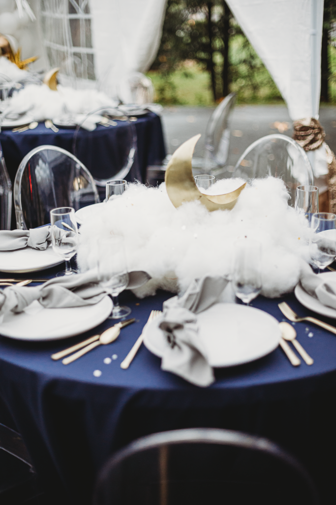Royal Rentals provided most rentals and decorations including backdrops, tables, chairs, a tent, plate settings and heaters creating the base for custom decor and personalized touches. We also created custom centerpieces with gold metal moons and lit fluffy clouds. Other local rental vendors provided the luxury white bounce house, easel, marquee number, glass top TWO table, wooden moon prop and elegant clear chairs.