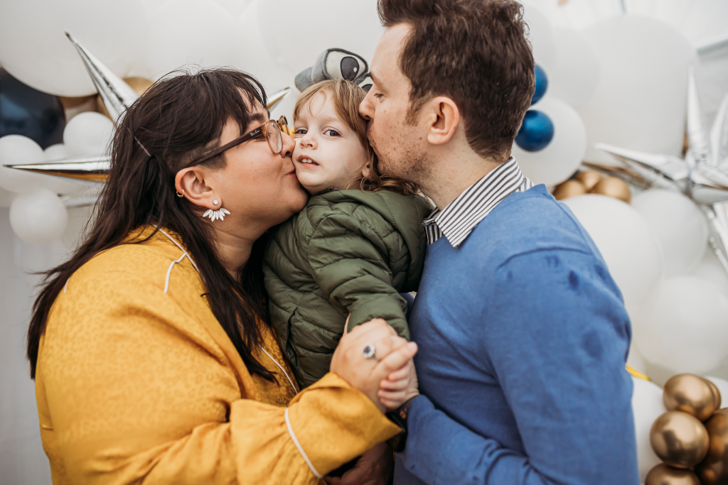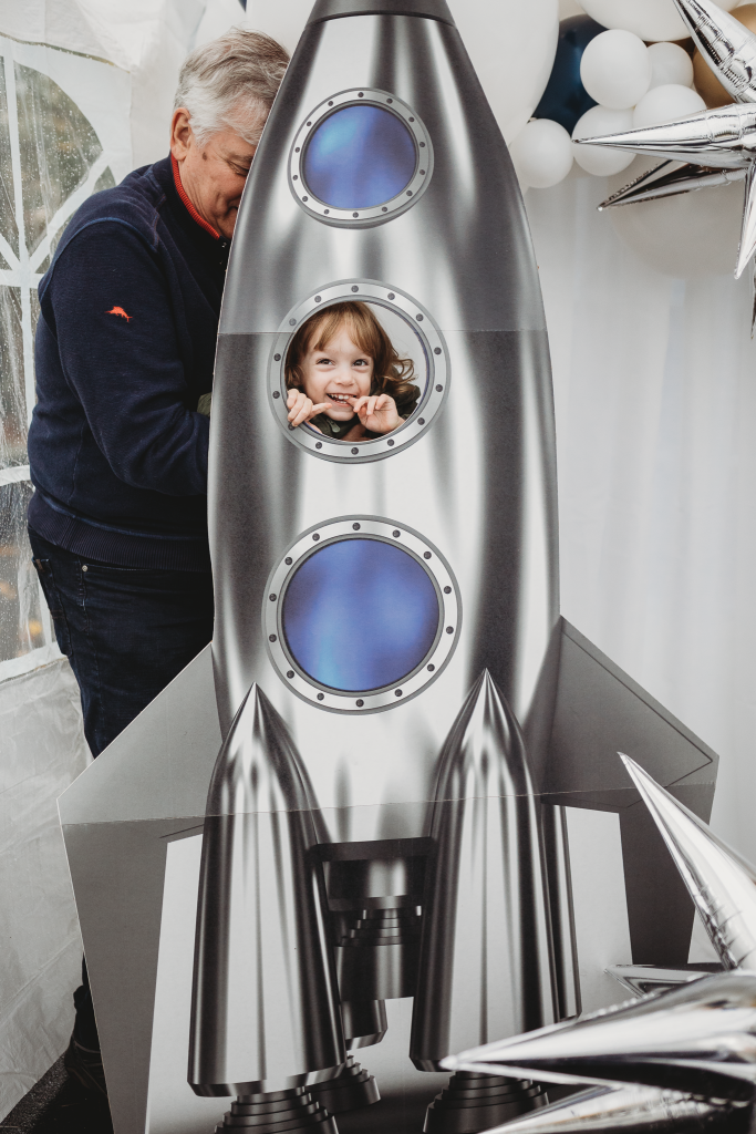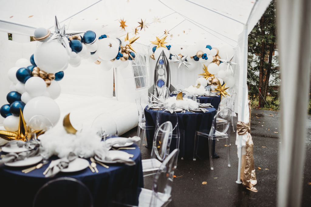 On a chilly October morning, we were back at it setting up a beautiful birthday party for the darling two-year-old, Avik. If you live in the New England area, you know once the leaves start falling the weather is only getting colder but that didn’t stop us from creating a fun indoor-outdoor birthday experience. Our hope was to utilize the backyard to its fullest potential and create a fun interactive space but due to the last-minute weather change we needed to add a tent and decided to keep the bounce house activity but place its entrance just under the tent. Astrid purchased fun interactive coloring pages for the kids at a local toy store and some of her family members dressed up in astronaut costumes which was ‘out of this world’!