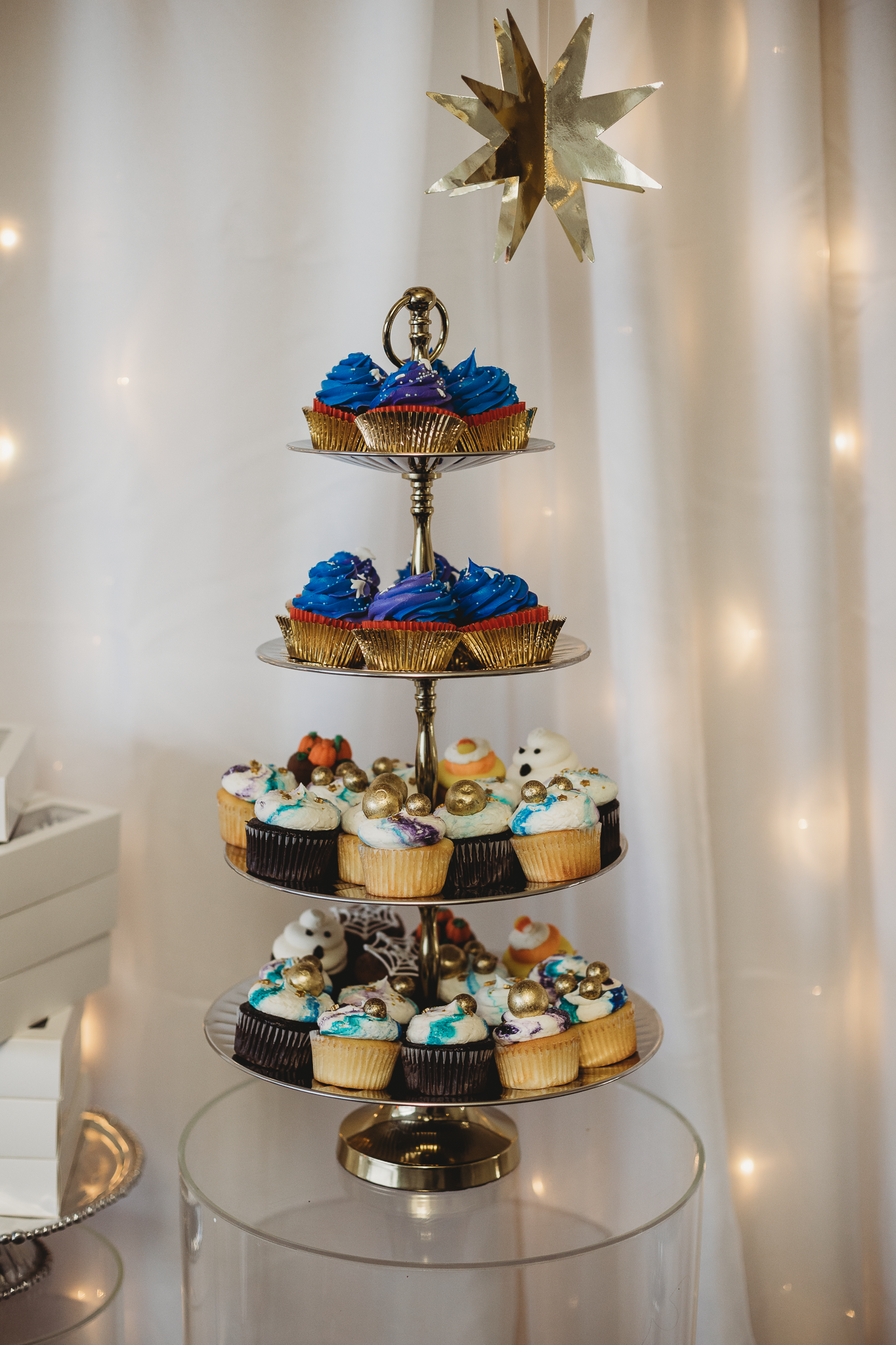 Royal Rentals provided most rentals and decorations including backdrops, tables, chairs, a tent, plate settings and heaters creating the base for custom decor and personalized touches. We also created custom centerpieces with gold metal moons and lit fluffy clouds. Other local rental vendors provided the luxury white bounce house, easel, marquee number, glass top TWO table, wooden moon prop and elegant clear chairs.