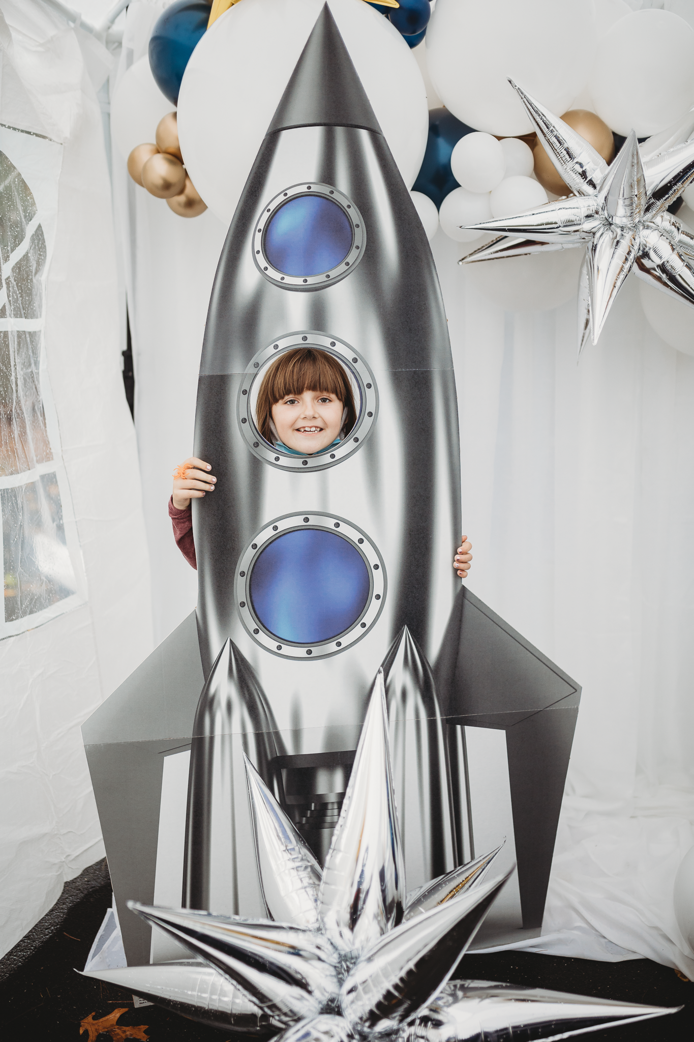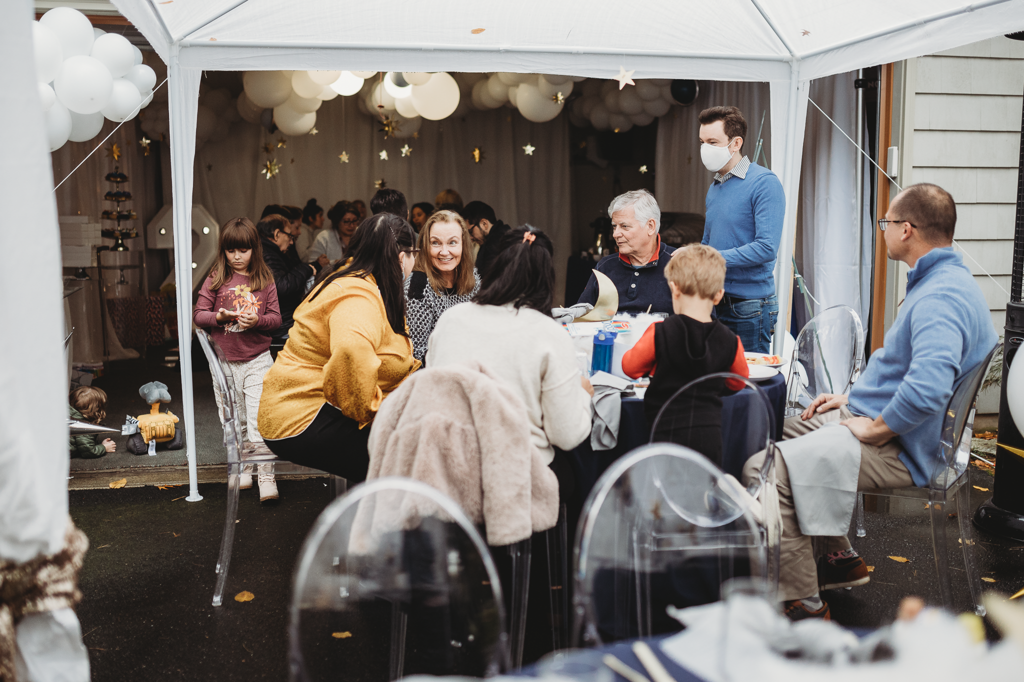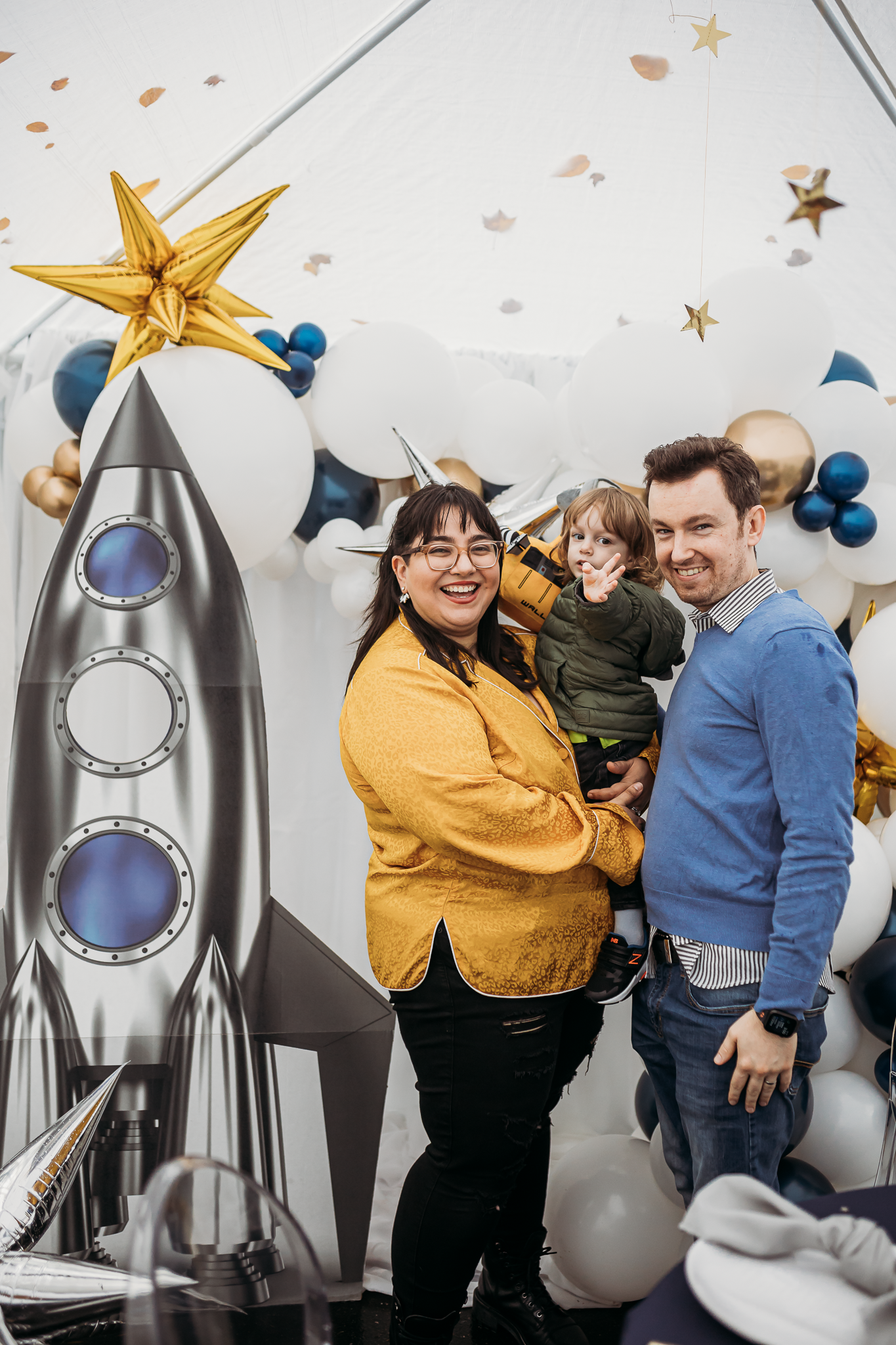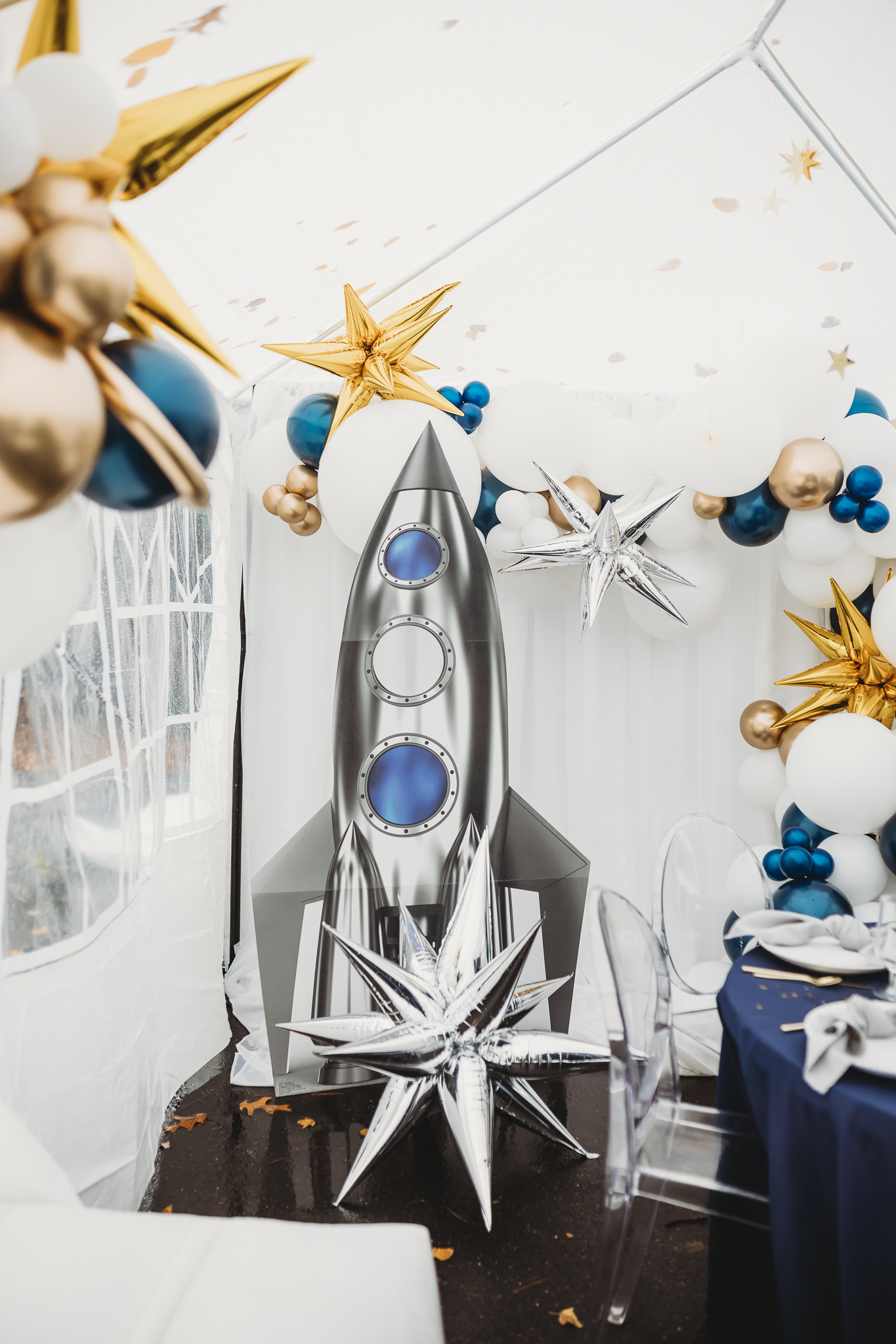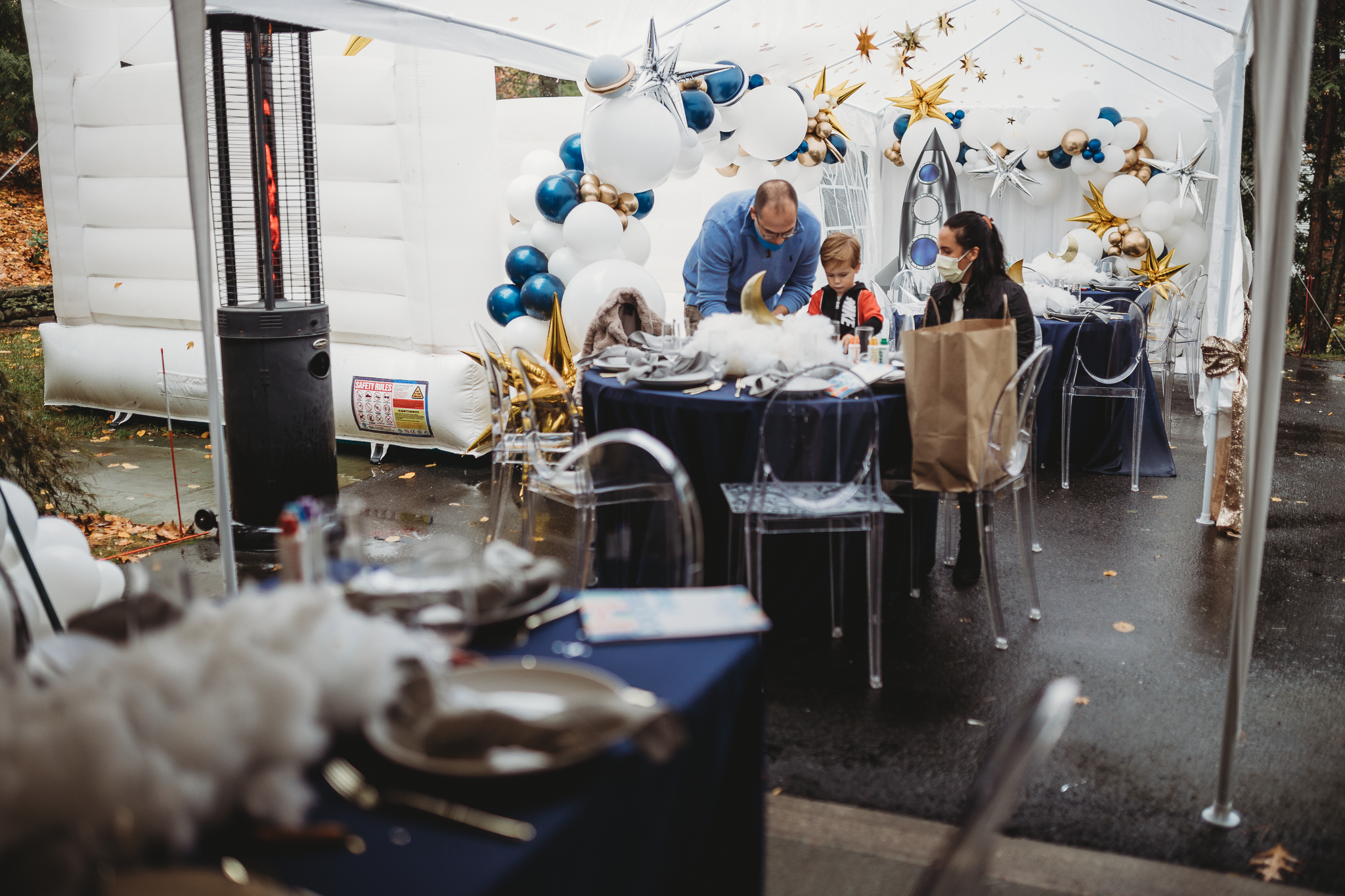 On a chilly October morning, we were back at it setting up a beautiful birthday party for the darling two-year-old, Avik. If you live in the New England area, you know once the leaves start falling the weather is only getting colder but that didn’t stop us from creating a fun indoor-outdoor birthday experience. Our hope was to utilize the backyard to its fullest potential and create a fun interactive space but due to the last-minute weather change we needed to add a tent and decided to keep the bounce house activity but place its entrance just under the tent. Astrid purchased fun interactive coloring pages for the kids at a local toy store and some of her family members dressed up in astronaut costumes which was ‘out of this world’!